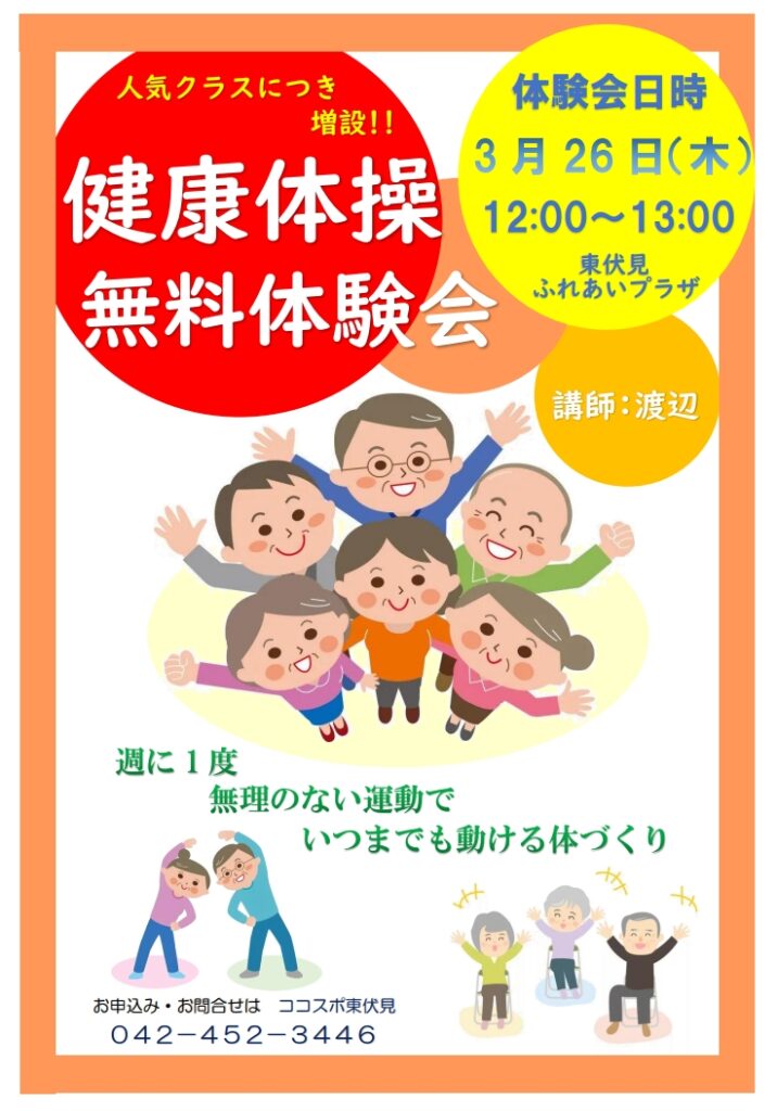 【参加者募集】健康体操体験会(無料) 人気クラスにつき増設!!